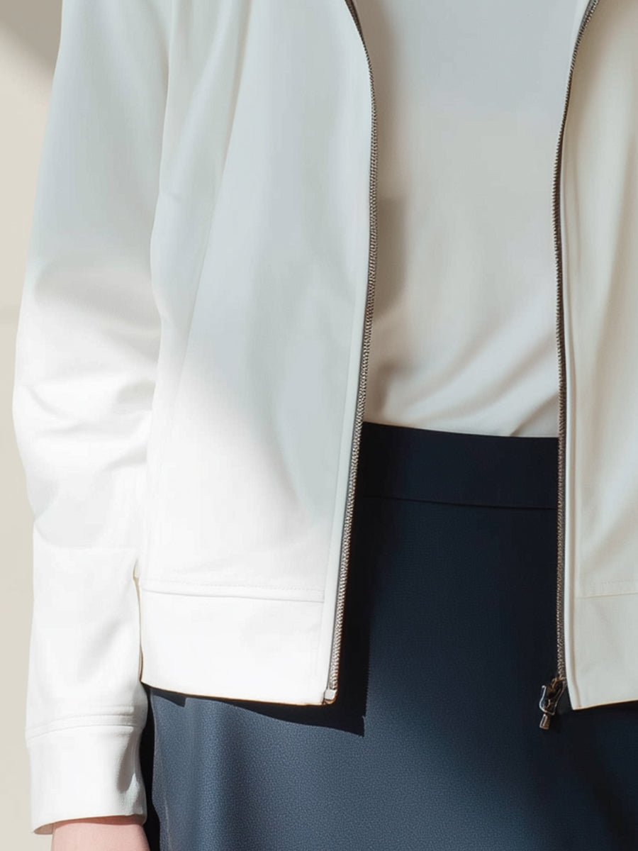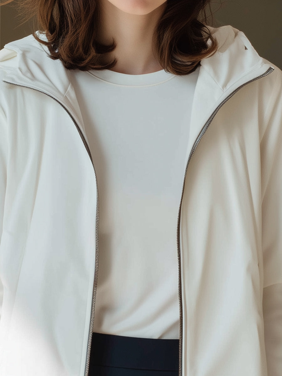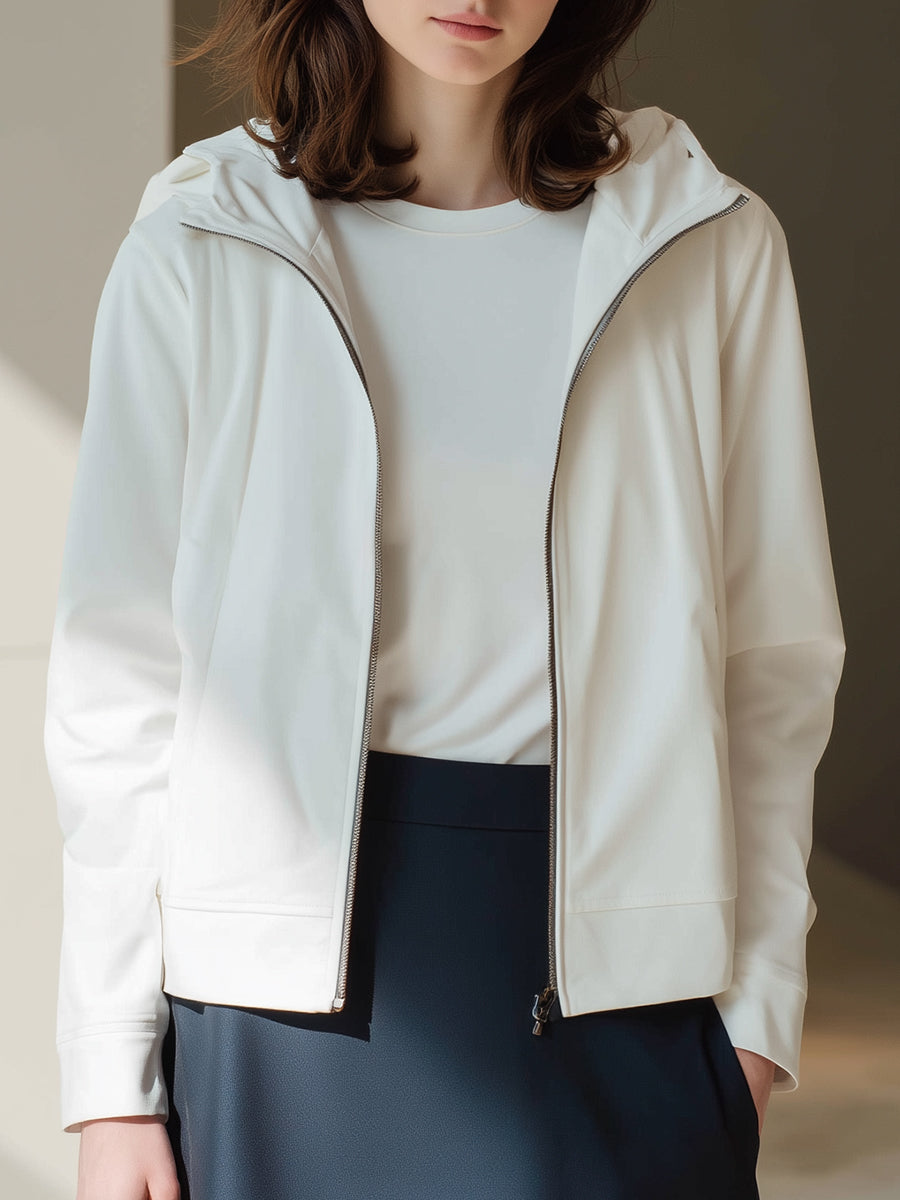 The silhouette is intentionally streamlined, featuring a subtle hood, a sleek two-way front zipper, and discreet side pockets that enhance functionality without disrupting the jacket’s elegant simplicity. Its crisp white tone brings a fresh, polished presence to any outfit, making it a perfect transitional piece for both indoor and outdoor environments. Whether paired with tailored trousers for a business-casual aesthetic or layered over a fitted top for weekend ease, the design adapts seamlessly to your rhythm.